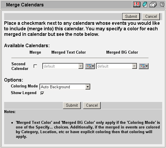 Each calendar available for merging is presented. Check those calendars that you would like to merge in to this calendar. The next time you access this calendar public events and to do list items from the merged in calendar will be displayed. The Coloring Mode parameter allows you to specify how the included events are colored as they are displayed. By default a Auto Background color is chosen, however you may chose Auto Text color selected instead. Additionally, you may specify specific text and background colors for each merged in calendar directly. Note that this option is only available when the Coloring Mode is one of the Specify... choices. The Show Legend option will either display or not display a legend at the bottom of the current calendar indicating which events come from which merged in calendar. There is a hard coded limit of 20 merged in calendar for any given current calendar. This is for performance reasons. You may not merge together more than 20 calendars. Test the performance of your merged calendars - merging is a performance intensive operation. Merging is not hierarchical. For example you may not create a merged calendar called Sales Department and then merge that calendar into a higher level calendar called All Departments. No events would be merged in to the All Departments calendar. |