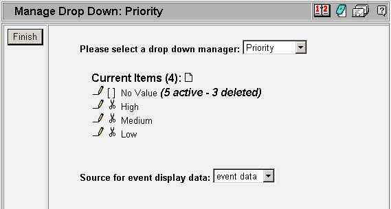 What is the Drop Down Manager The Event Add/Edit screen contains a number of Drop Down boxes for specifying things such as Category, Location or Priority. For want of a better word we call these things Drop Downs and provide an intuitive icon based interface for editing the values in these drop downs with this screen.