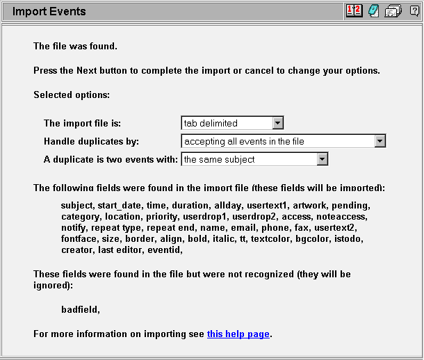 After pressing the Next button you are presented with the Event Import Confirmation screen.