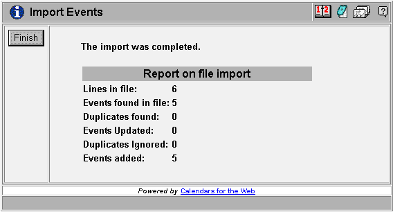 This final screen will show you exactly what happened as a result of the event import. Press Finish to return to the Administration screen. Note: You may use the Import feature paired with the Export feature to copy events from one calendar to another by exporting all fields including the display related fields. Note: Please see the help file called ASCII Front End for information on doing an automatic continuous import of ascii text data. |