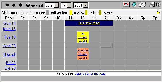 Each day in the planner view type is displayed down the left-hand side of the screen under the 'Date' column. For the Week and Month planners you may follow these links to a Day Planner calendar. The Day Planner links to the Day List View. Along the top of the planner calendar are the hours of the day (see notes). Each box in the planner grid containing one or more events (that is, some portion of an event's duration overlaps the period of the box) is displayed in 'hasEvents' color. In this way you can see exactly when there is free time and exactly when there is not. If you are logged in, empty cells in the planner view take on additional meaning: clicking on the cell will allow you to schedule an event at that time period, You may customize the display of each event in this view using Event Display String. |