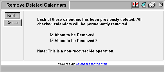 If there are no previously deleted calendars this screen will inform you of that. If there are previously deleted calendars you may press the Next button to permanently remove the checked calendars. Uncheck those calendars that you would rather not remove. Important Note: This is a non-recoverable operation.